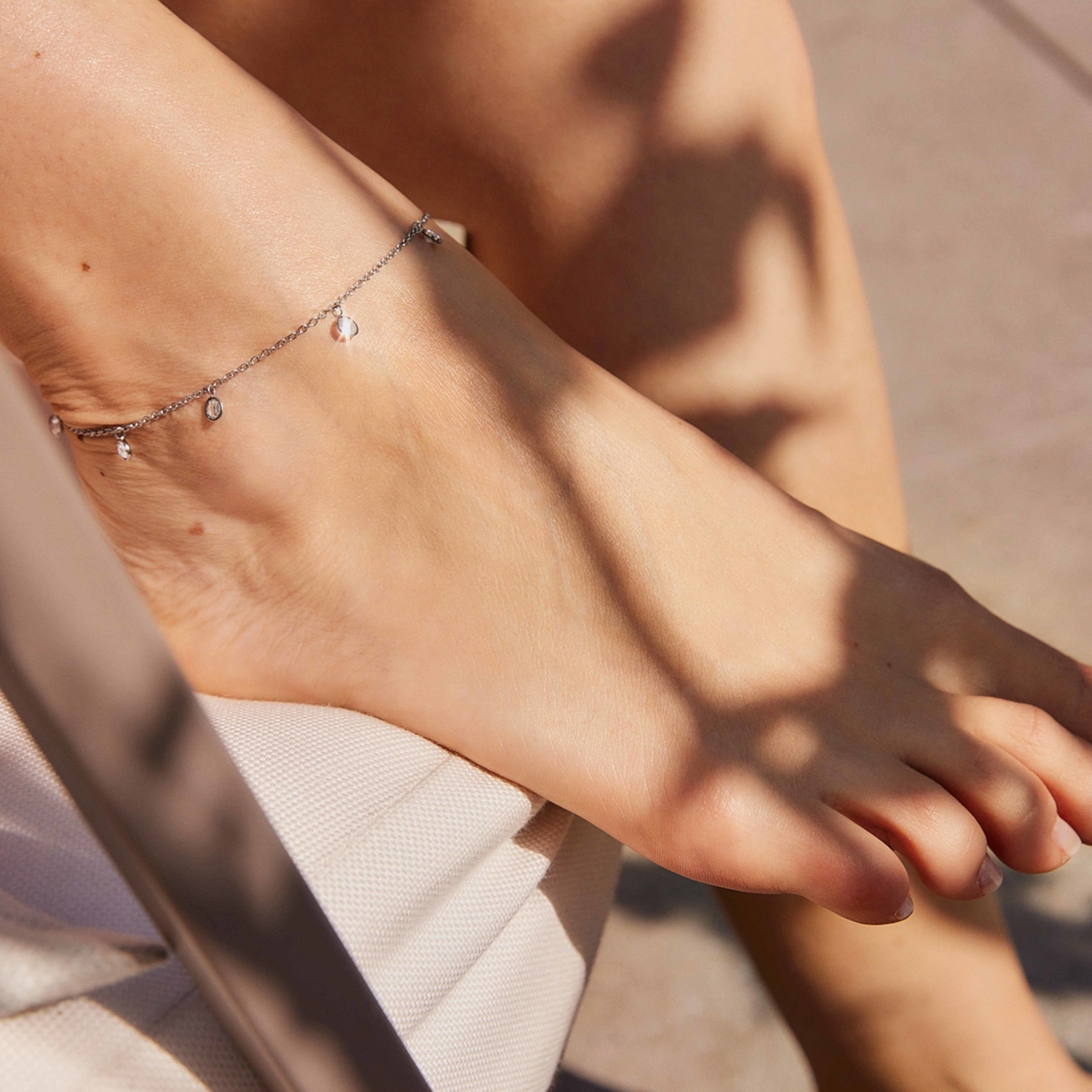 Sommerliches Fußkettchen für Damen von Amor. Die filigrane Ankerkette aus robustem Edelstahl 316L ist das perfekte Accessoire für laue Sommernächste. Die mit Zirkonia Steinen besetzten Anhänger sind das i-Tüpfelchen dieses Fußschmucks. Jeder der sieben Anhänger, die an ein Bettelarmband erinnern, trägt einen Zirkonia Stein. Die Fußkette ist längenverstellbar (23+2 cm) und passt sich somit bequem seiner Trägerin an. Das Sommeraccessoire lässt sich gut mit weiteren Schmuckstücken kombinieren. Mit dem passenden Outfit und der richtigen Sandale erschaffst du den perfekten Look für warme Tage. Entdecke darüber hinaus das passende Armband und komplettiere deinen Look.