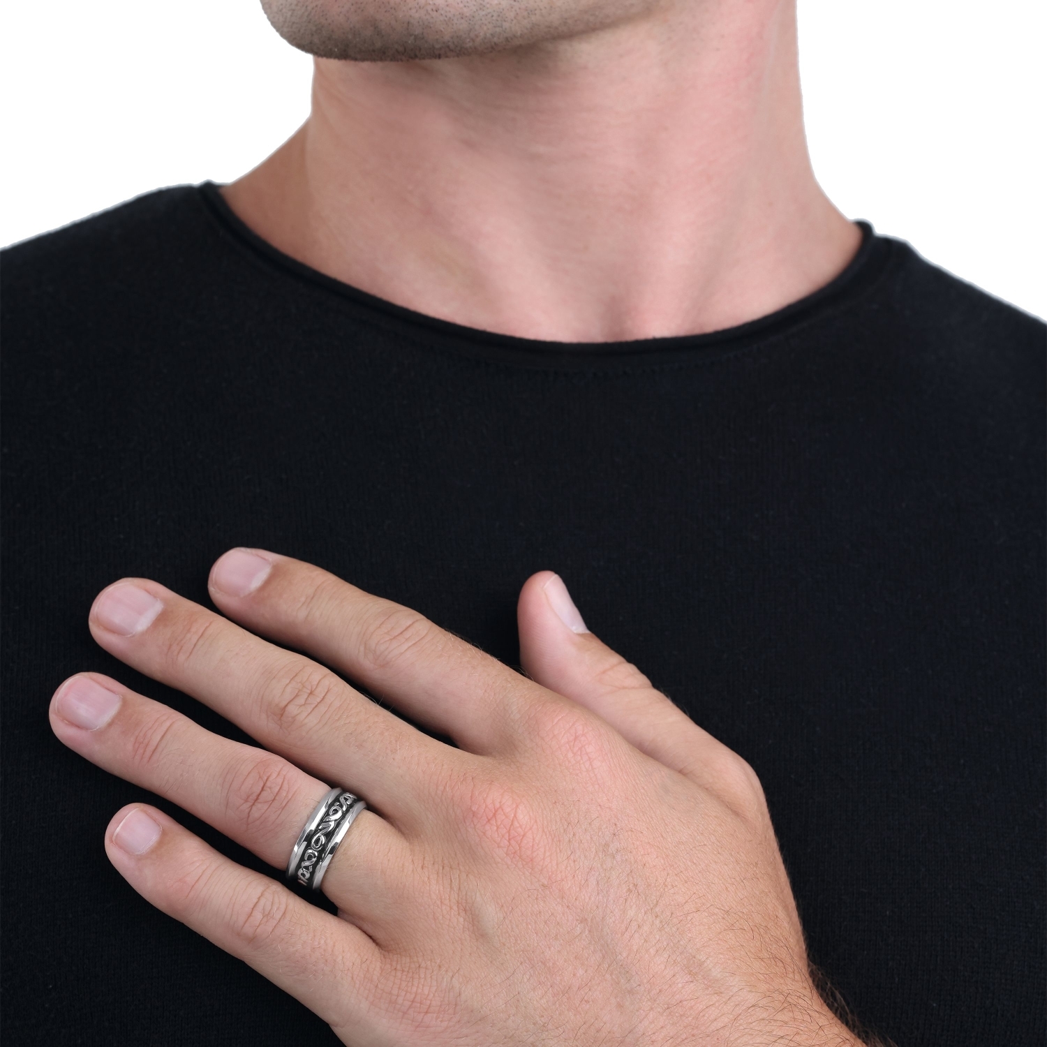 Der Hingucker am Handgelenk: dieser Unisex Ring der Echtschmuck-Marke Amor kann Frau und Mann tragen. Eine Emaille malt ein aufwändiges Tribal-Muster auf den aus Edelstahl gefertigten Ring. Das auffällige Schmuckstück kann sowohl einzeln als auch in Kombination mit mehreren Ringen – wie beim angesagten Mix & Match-Trend – getragen werden. Die zweidimensionale Relief-Oberfläche dieses Fingerschmucks ist ein haptisches Erlebnis.