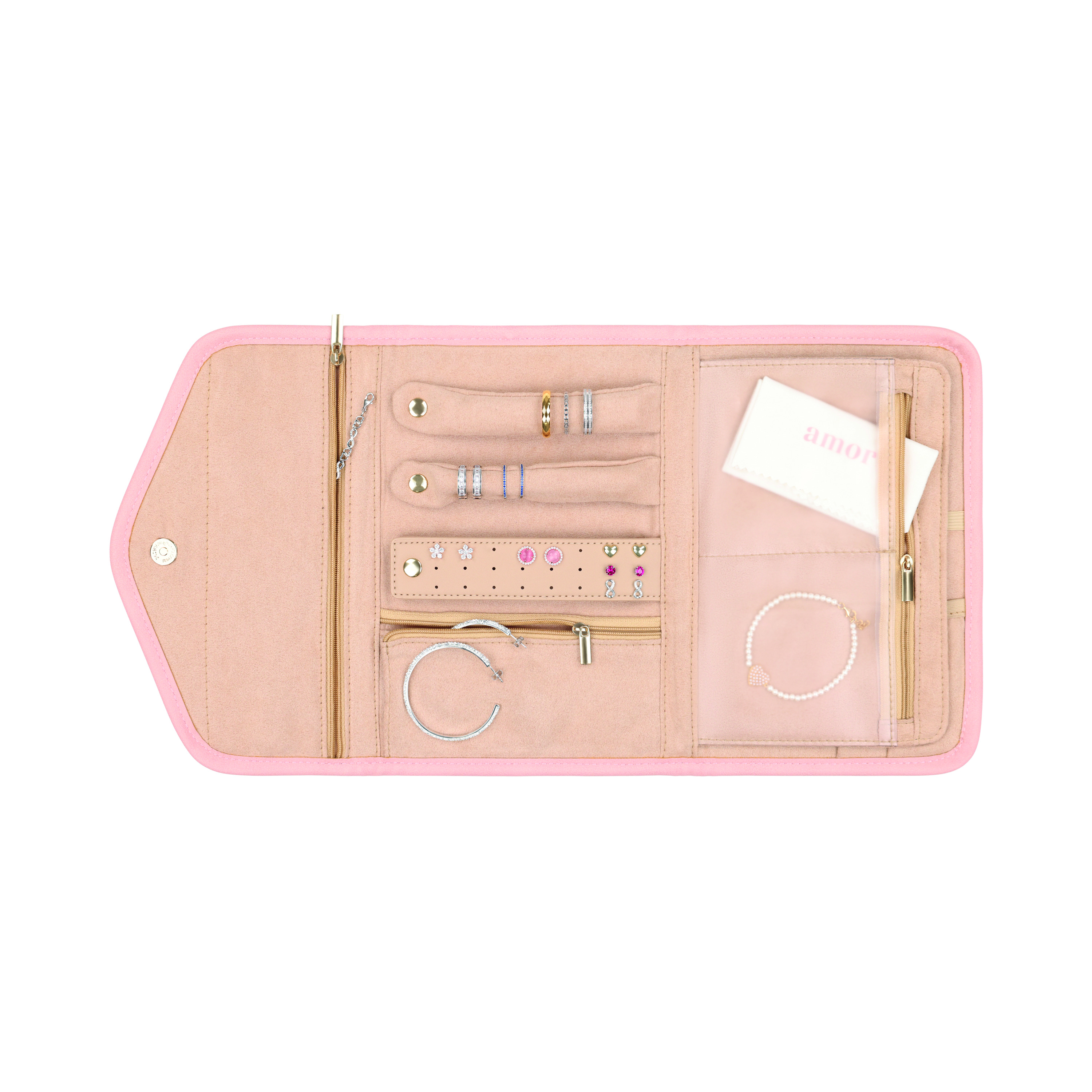 Travelling made easy – das Amor Reise Etui! Wer kennt nicht das Problem? Wohin mit dem Schmuck für den nächsten Sommerurlaub, die Kreuzfahrt oder vielleicht die nächste Weltreise? Wir haben hierfür jetzt die passende Lösung: Unser Travel Organizer. Verpasse keine Möglichkeit für das perfekte Foto im Sonnenuntergang oder auf Safari, sei auf jede Eventualität mit dem richtigen Schmuckstück vorbereitet - hab` all deine Accessoires bei dir für den perfekten Look. Hier verstaust du einfach Ringe, Armbänder, Ketten, Ohrringe etc. Diese moderne Schmuck Clutch ist aus hochwertigen Materialen hergestellt und der Hingucker zum kleinen Schwarzen.