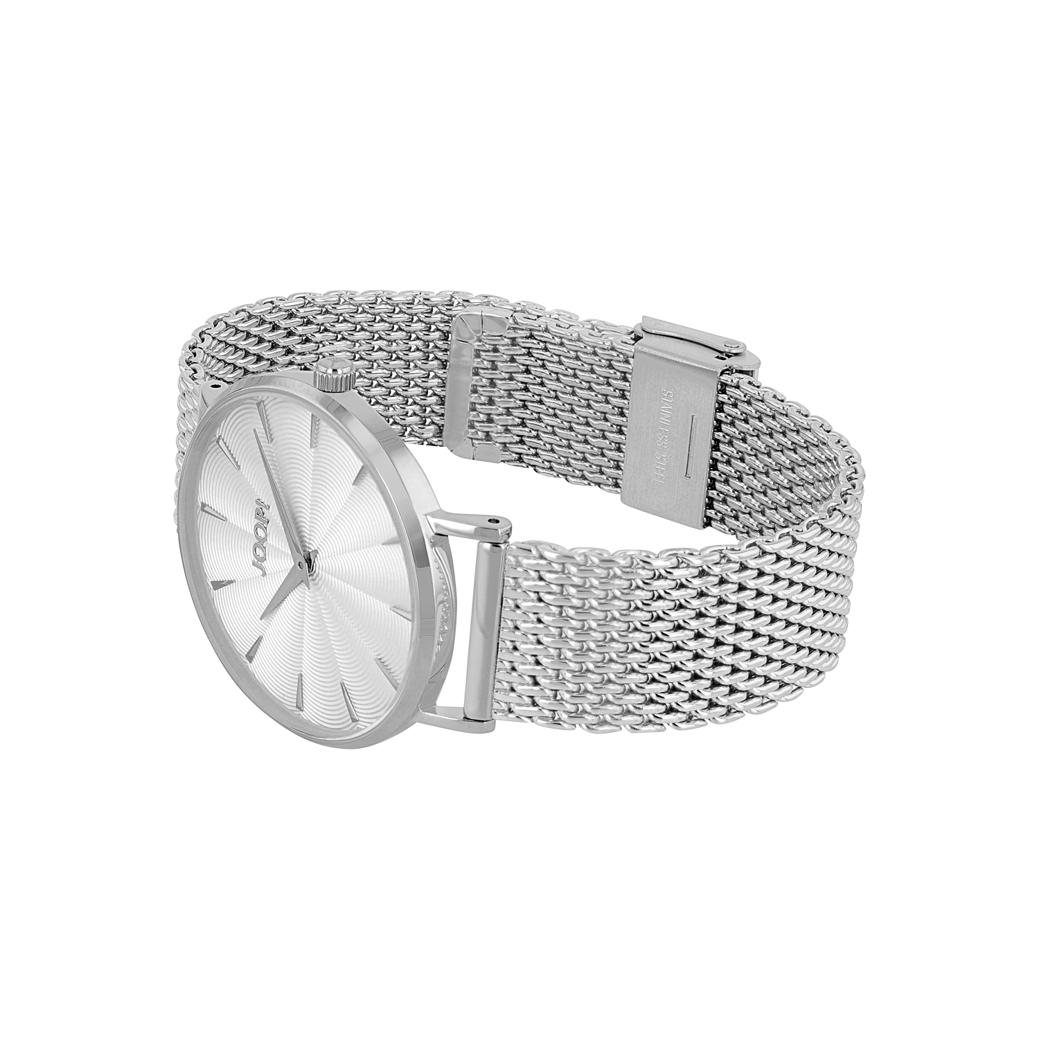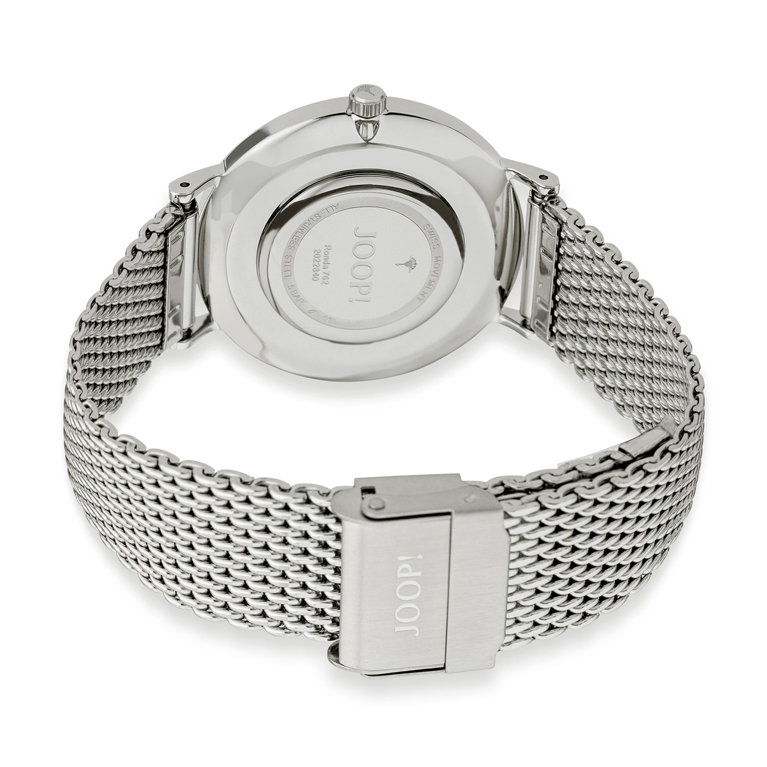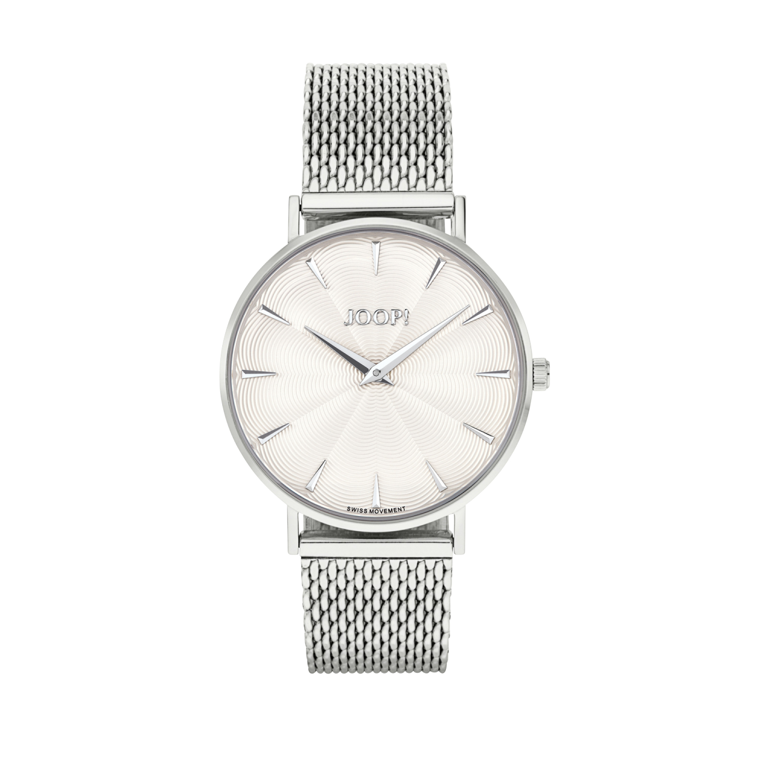 Diese moderne Armbanduhr für Damen der Marke JOOP! zeichnet sich durch das runde Gehäuse und das Milanaise-Armband aus hochwertigem Edelstahl aus. In Kombination mit dem strukturierten Ziffernblatt zeigt sich die Damenuhr von JOOP! als elegantes Accessoire, ergänzt durch ein glänzendes Logo-Lettering. Robustes Mineralglas schützt zusätzlich das Ziffernblatt. Das funktionale Finish bilden das Citizen Miyota Quarzuhrwerk mit Sekundenzeiger sowie der Schiebeverschluss. Das Armband lässt sich zwischen 11 und 20 cm Länge individuell verstellen.