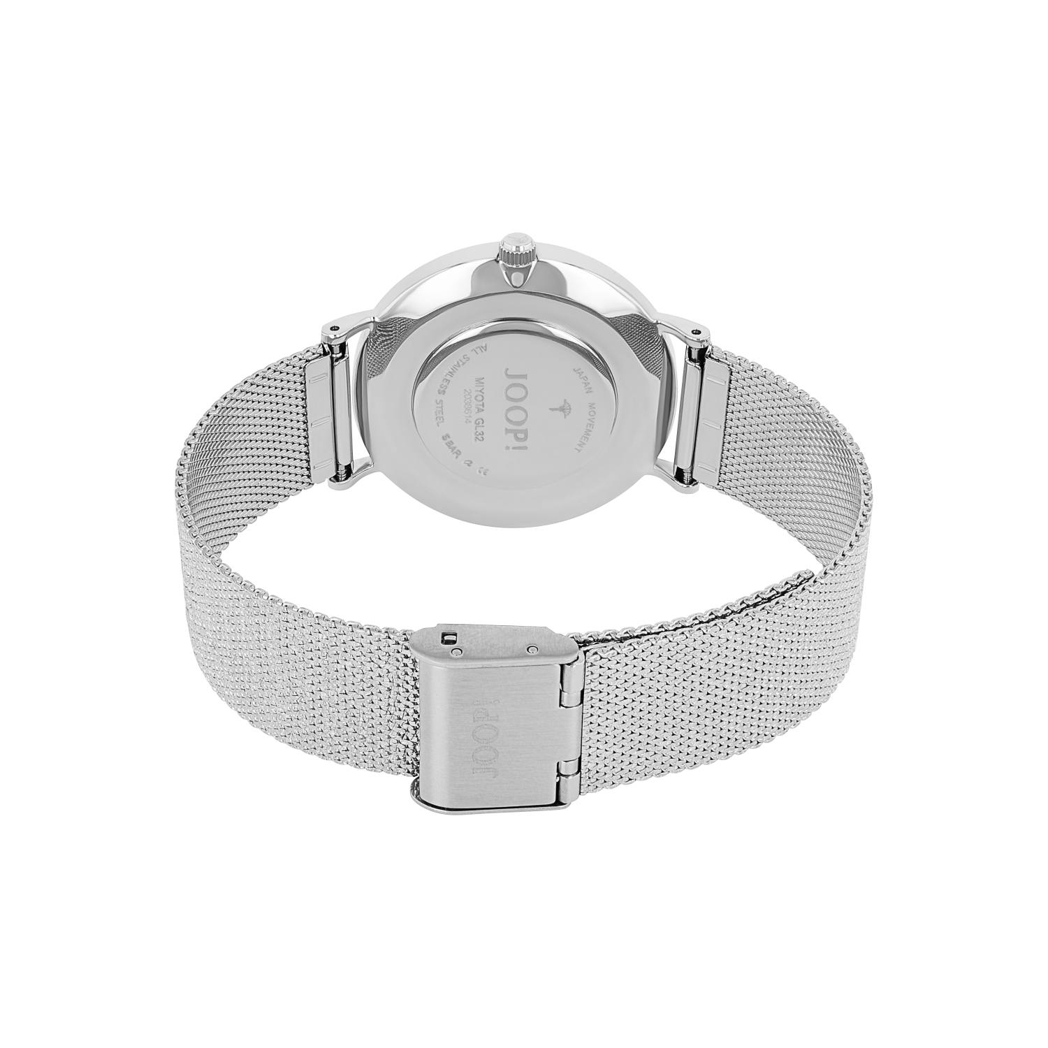 Diese moderne Armbanduhr für Damen der Marke JOOP! zeichnet sich durch das runde Gehäuse und das Milanaise-Armband aus hochwertigem Edelstahl aus. In Kombination mit dem strukturierten Ziffernblatt zeigt sich die Damenuhr von JOOP! als elegantes Accessoire, ergänzt durch ein glänzendes Logo-Lettering. Robustes Mineralglas schützt zusätzlich das Ziffernblatt. Das funktionale Finish bilden das Citizen Miyota Quarzuhrwerk mit Sekundenzeiger sowie der Schiebeverschluss. Das Armband lässt sich zwischen 11 und 20 cm Länge individuell verstellen.