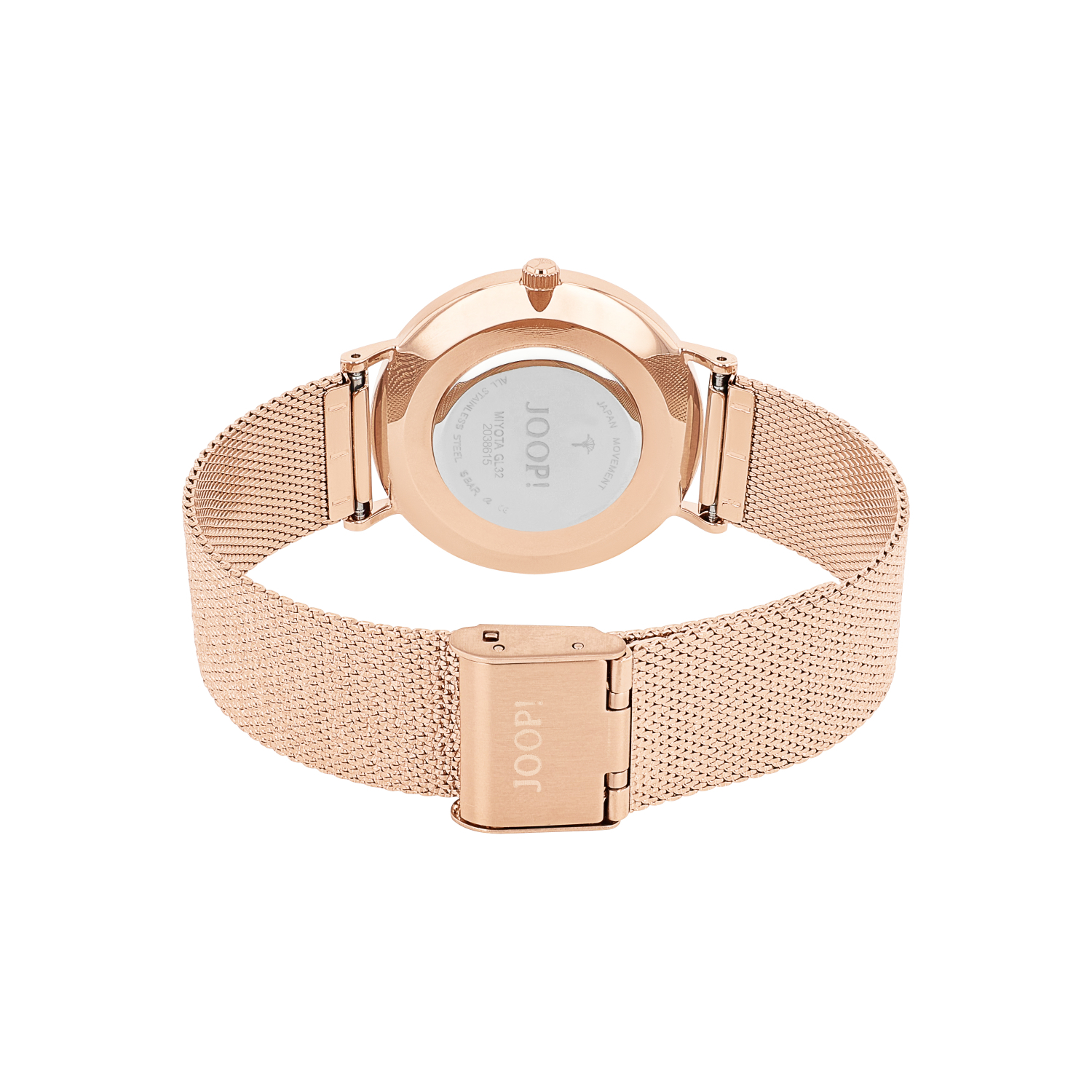Diese moderne Armbanduhr für Damen der Marke JOOP! zeichnet sich durch das runde Gehäuse und das Milanaise-Armband aus hochwertigem Edelstahl aus. In Kombination mit dem strukturierten Ziffernblatt zeigt sich die Damenuhr von JOOP! als elegantes Accessoire, ergänzt durch ein glänzendes Logo-Lettering. Robustes Mineralglas schützt zusätzlich das Ziffernblatt. Das funktionale Finish bilden das Citizen Miyota Quarzuhrwerk mit Sekundenzeiger sowie der Schiebeverschluss. Das Armband lässt sich zwischen 11 und 20 cm Länge individuell verstellen.