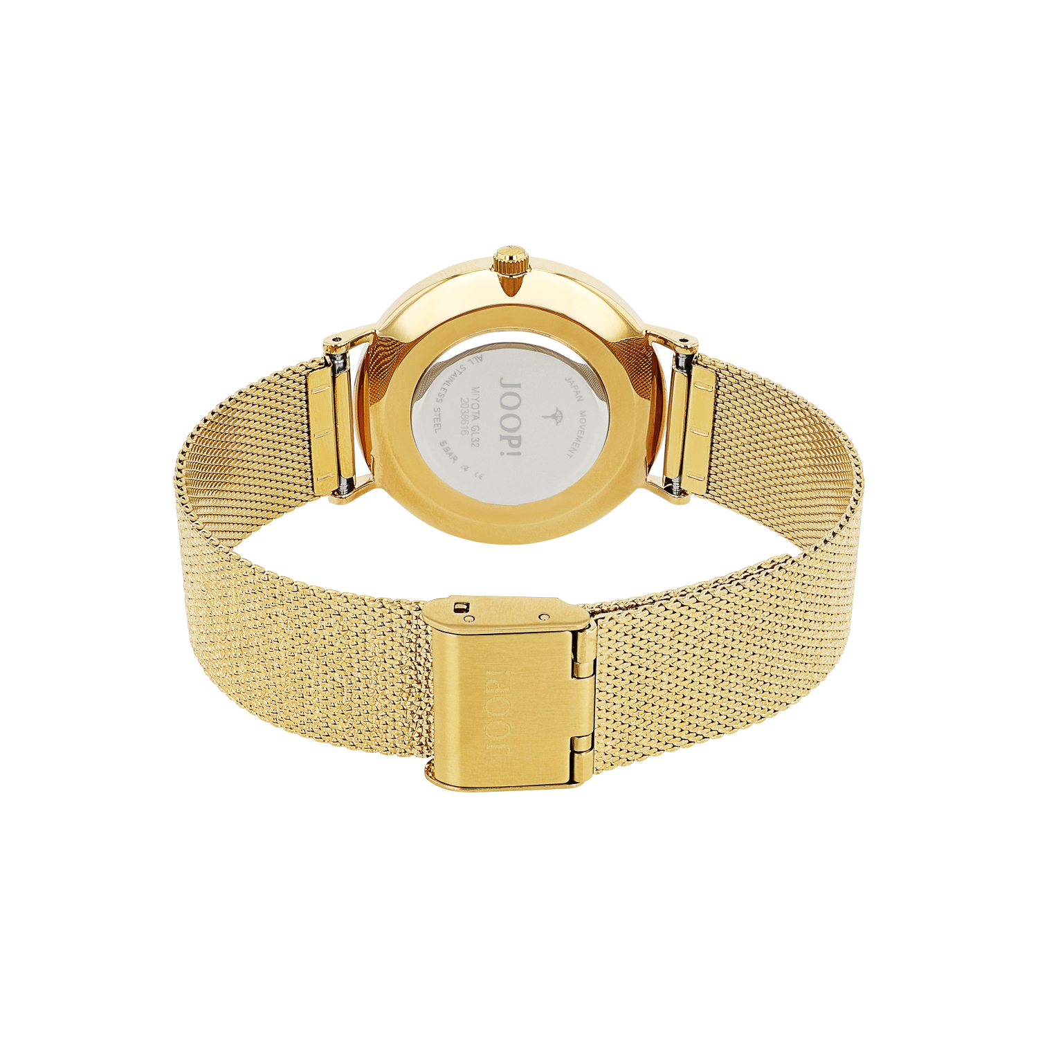 Diese moderne Armbanduhr für Damen der Marke JOOP! zeichnet sich durch das runde Gehäuse und das Milanaise-Armband aus hochwertigem Edelstahl aus. In Kombination mit dem strukturierten Ziffernblatt zeigt sich die Damenuhr von JOOP! als elegantes Accessoire, ergänzt durch ein glänzendes Logo-Lettering. Robustes Mineralglas schützt zusätzlich das Ziffernblatt. Das funktionale Finish bilden das Citizen Miyota Quarzuhrwerk mit Sekundenzeiger sowie der Schiebeverschluss. Das Armband lässt sich zwischen 11 und 20 cm Länge individuell verstellen.