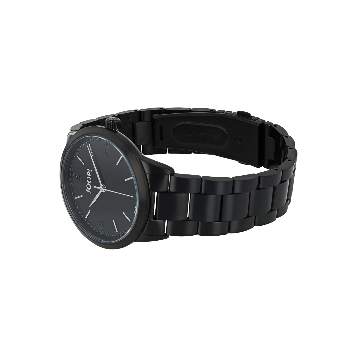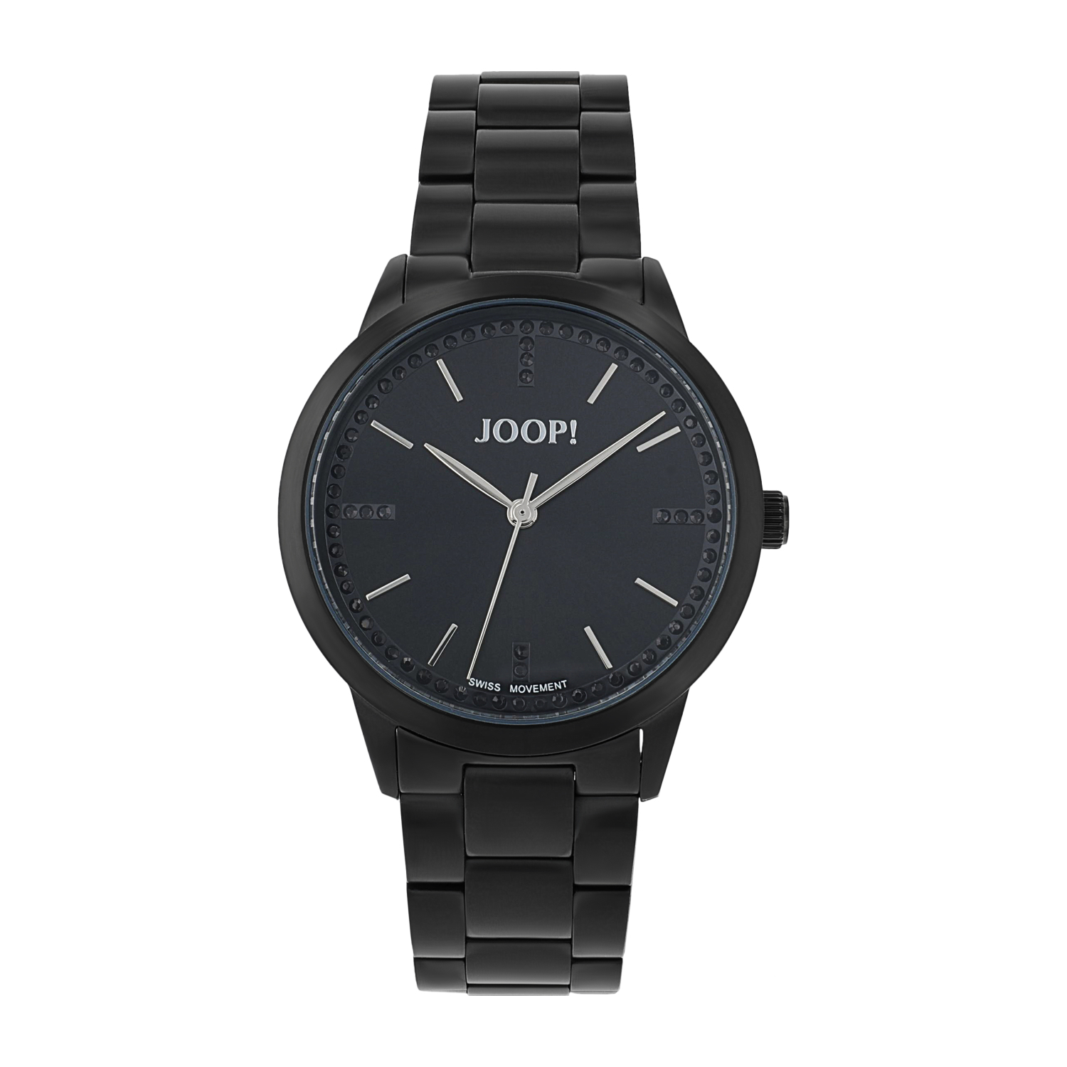 Damenuhr von JOOP!. Diese Armbanduhr für Damen von der Marke JOOP! präsentiert sich im klassischen Design mit modernen Features. Die Damenuhr wurde aus hochwertigem, kratzfestem Edelstahl gefertigt. Das Armband der Uhr Damen ist mit einem praktischen Kippfalt-Verschluss versehen und 18 cm lang. Dieser bietet eine einfache Handhabe sowie Sicherheit beim Tragen. Highlight der auffälligen Damen Uhr von JOOP! sind die zahlreichen strahlenden Zirkonia Steine auf dem Gehäuse, die das Zifferblatt umrunden. Für die präzise Zeitangabe sorgt ein hochwertiges Ronda Swiss Made Uhrwerk. Die Damen-Armbanduhr ist wasserdicht bis zu einer Tiefe von 5 Bar. Dennoch empfiehlt es sich, die Damenuhr vor dem Schwimmen, sowie weiteren Aktivitäten im Wasser abzulegen. Die Armbanduhr kommt in einer passenden Verpackung und eignet sich somit als Geschenk zu besonderen Anlässen.