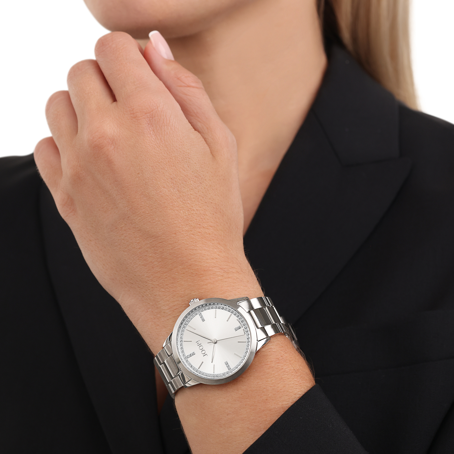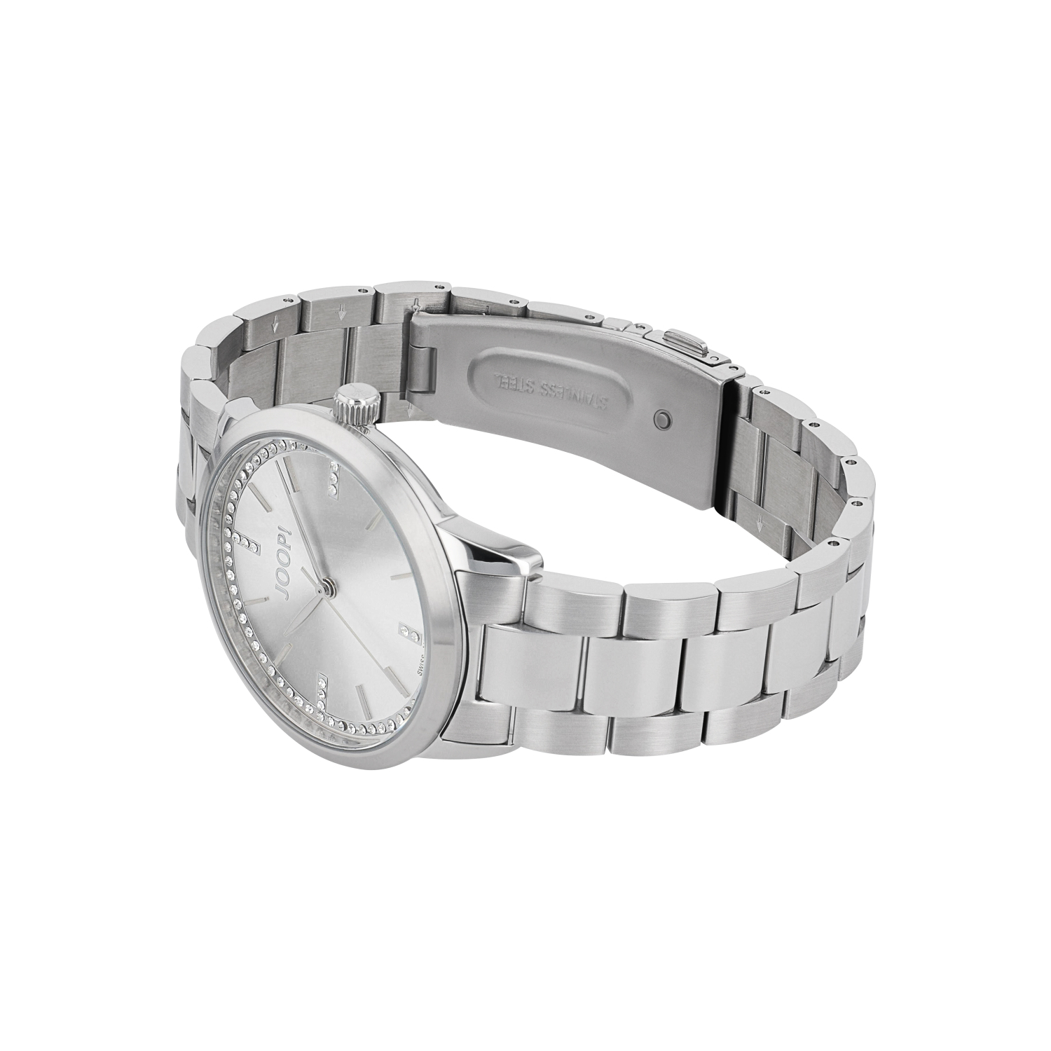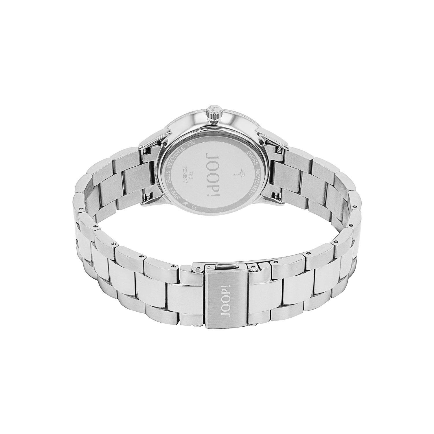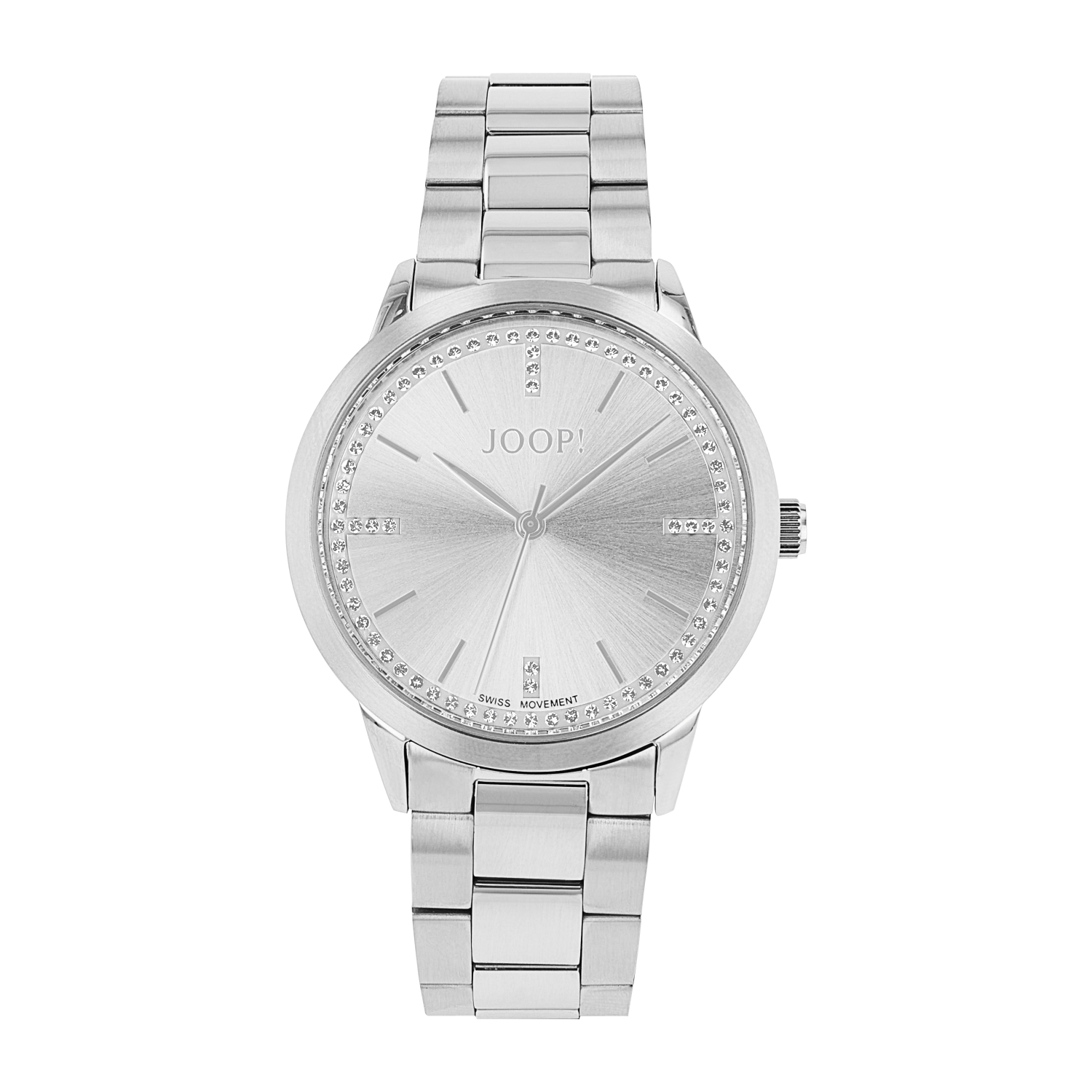 Damenuhr von JOOP!. Diese Armbanduhr für Damen von der Marke JOOP! präsentiert sich im klassischen Design mit modernen Features. Die Damenuhr wurde aus hochwertigem, kratzfestem Edelstahl gefertigt. Das Armband der Uhr Damen ist mit einem praktischen Kippfalt-Verschluss versehen und 18 cm lang. Dieser bietet eine einfache Handhabe sowie Sicherheit beim Tragen. Highlight der auffälligen Damen Uhr von JOOP! sind die zahlreichen strahlenden Zirkonia Steine auf dem Gehäuse, die das Zifferblatt umrunden. Für die präzise Zeitangabe sorgt ein hochwertiges Ronda Swiss Made Uhrwerk. Die Damen-Armbanduhr ist wasserdicht bis zu einer Tiefe von 5 Bar. Dennoch empfiehlt es sich, die Damenuhr vor dem Schwimmen, sowie weiteren Aktivitäten im Wasser abzulegen. Die Armbanduhr kommt in einer passenden Verpackung und eignet sich somit als Geschenk zu besonderen Anlässen.