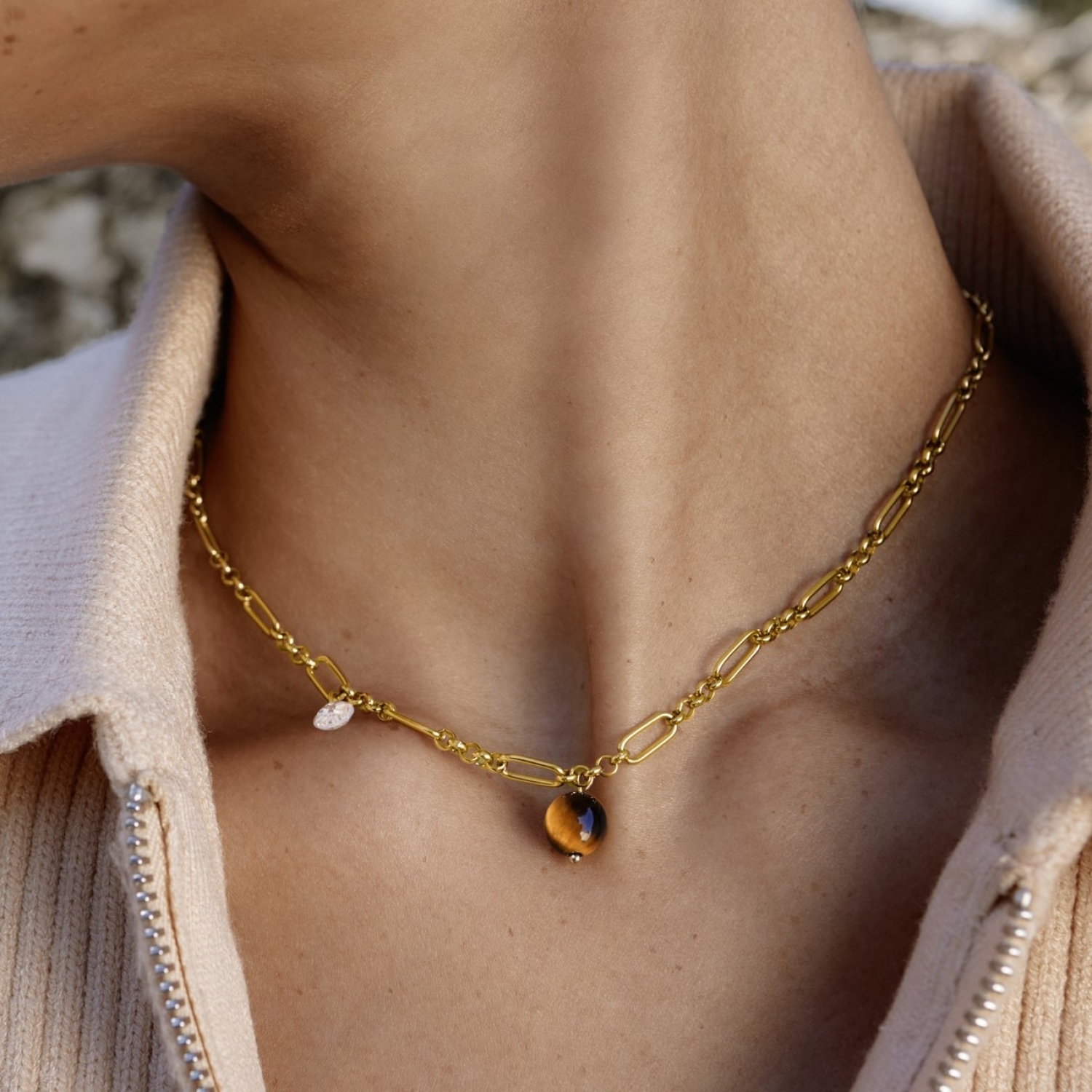 - Die Kette wurde aus hochwertigem Edelstahl gefertigt und ist mit Tigerauge-Steinen besetzt