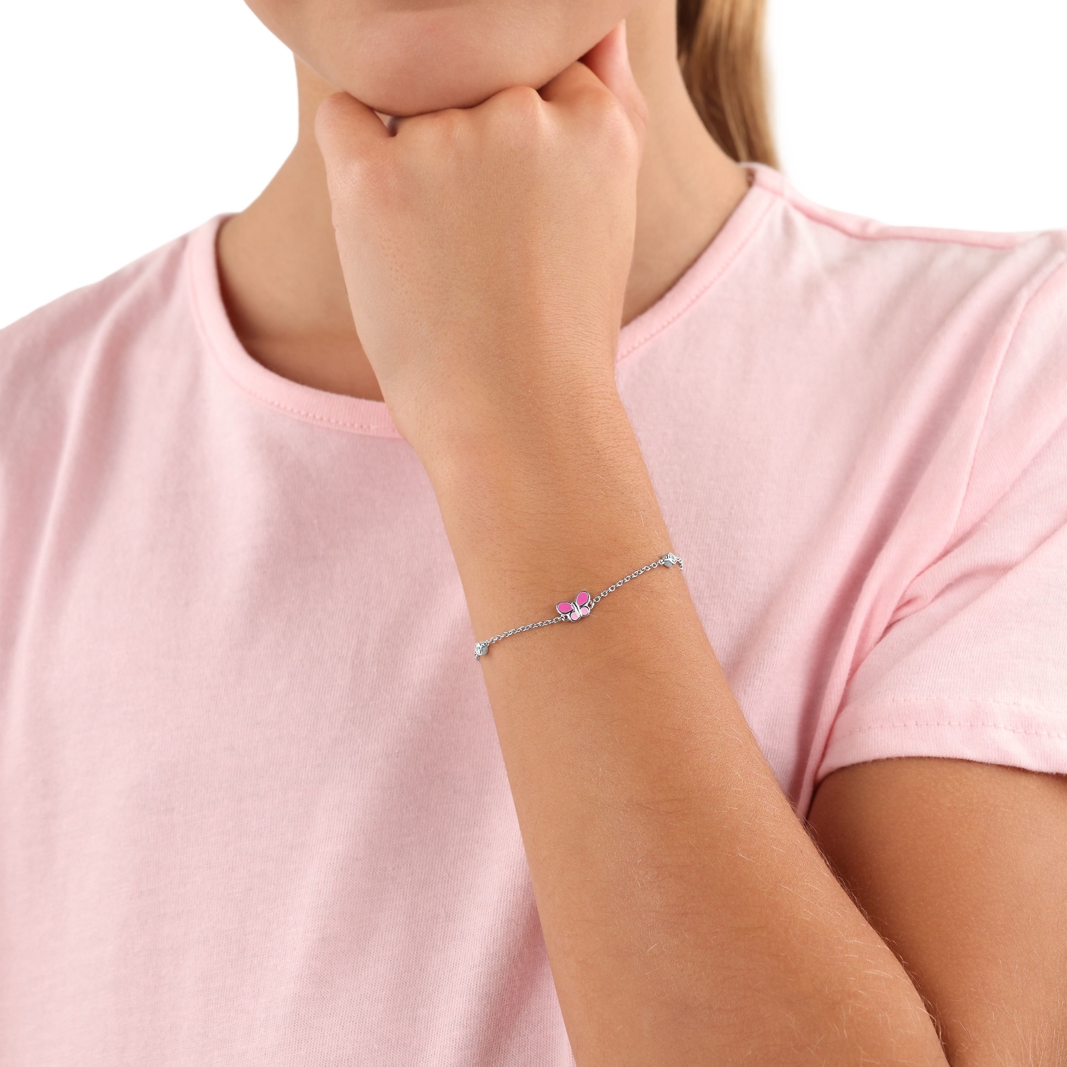 Niedliches Armband mit Schmetterling-Motiv für Mädchen von Prinzessin Lillifee. Das süße Mädchenarmband der Marke Prinzessin Lillifee lässt Feenträume wahr werden. Die Armkette wurde aus hochwertigem 925 Sterling Silber gefertigt, wodurch deine kleine Prinzessin noch länger Freude an dem Accessoire haben wird. In die Rundankerkette sind ein süßer Schmetterling und zwei strahlende Zirkoniasteine (synth.) eingearbeitet. Die Flügel des Schmetterlings sind mit einer Emaille versehen. Das Mädchenarmband ist zwischen 12 und 15 cm individuell längenverstellbar und wächst hierdurch mit. Für einen sicheren Halt und ein einfaches An- und Ablegen sorgt ein praktischer Karabinerverschluss. Das Armband für Kinder lässt sich gerne mit weiteren Schmuckstücken kombinieren, beispielsweise mit den passenden Ohrsteckern oder der stimmigen Halskette.